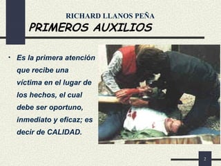 Este documento presenta información sobre las funciones vitales evaluadas en primeros auxilios. Explica que las funciones vitales incluyen la respiración, signos de circulación, presión arterial y temperatura, y describe cómo evaluar cada una, incluyendo la frecuencia normal. Además, proporciona instrucciones sobre cómo tomar el pulso, la respiración y la presión arterial.