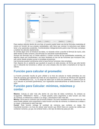 Calc es una hoja de cálculo compatible con Excel que forma parte de la suite ofimática OpenOffice.org. Permite realizar cálculos mediante fórmulas y funciones predefinidas. Algunas funciones comunes incluyen promedio, máximo, mínimo y contar. Las funciones se pueden anidar y combinar para crear cálculos más complejos.