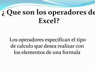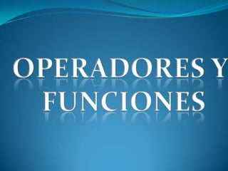 Este documento resume los operadores y funciones en Excel. Explica que los operadores especifican el tipo de cálculo en una fórmula y clasifica los operadores en aritméticos, de comparación, de texto y de referencia. Además, establece la prioridad de los operadores en Excel. También define qué son las funciones en Excel y cómo se clasifican en categorías como matemáticas, estadísticas, financieras y más.