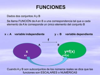 El documento define una función como una correspondencia entre dos conjuntos A y B donde a cada elemento de A le corresponde un único elemento de B. Explica que el dominio de una función es el conjunto de valores de la variable independiente y el rango es el conjunto de valores de la variable dependiente. Finalmente, describe diferentes formas de expresar funciones como de forma explícita, implícita, mediante tablas o gráficamente.