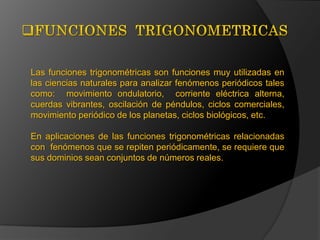 Las funciones trigonométricas se utilizan para analizar fenómenos periódicos como el movimiento ondulatorio y las oscilaciones. Las funciones seno, coseno y tangente son funciones periódicas cuya periodicidad y dominio en números reales las hacen útiles para estos análisis.