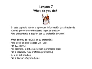 El documento proporciona instrucciones y ejemplos para practicar conversaciones sobre profesiones y lugares de trabajo en inglés. Incluye diálogos y preguntas sobre los nombres, profesiones, lugares de empleo y países de origen de varias personas como parte de actividades de práctica conversacional.