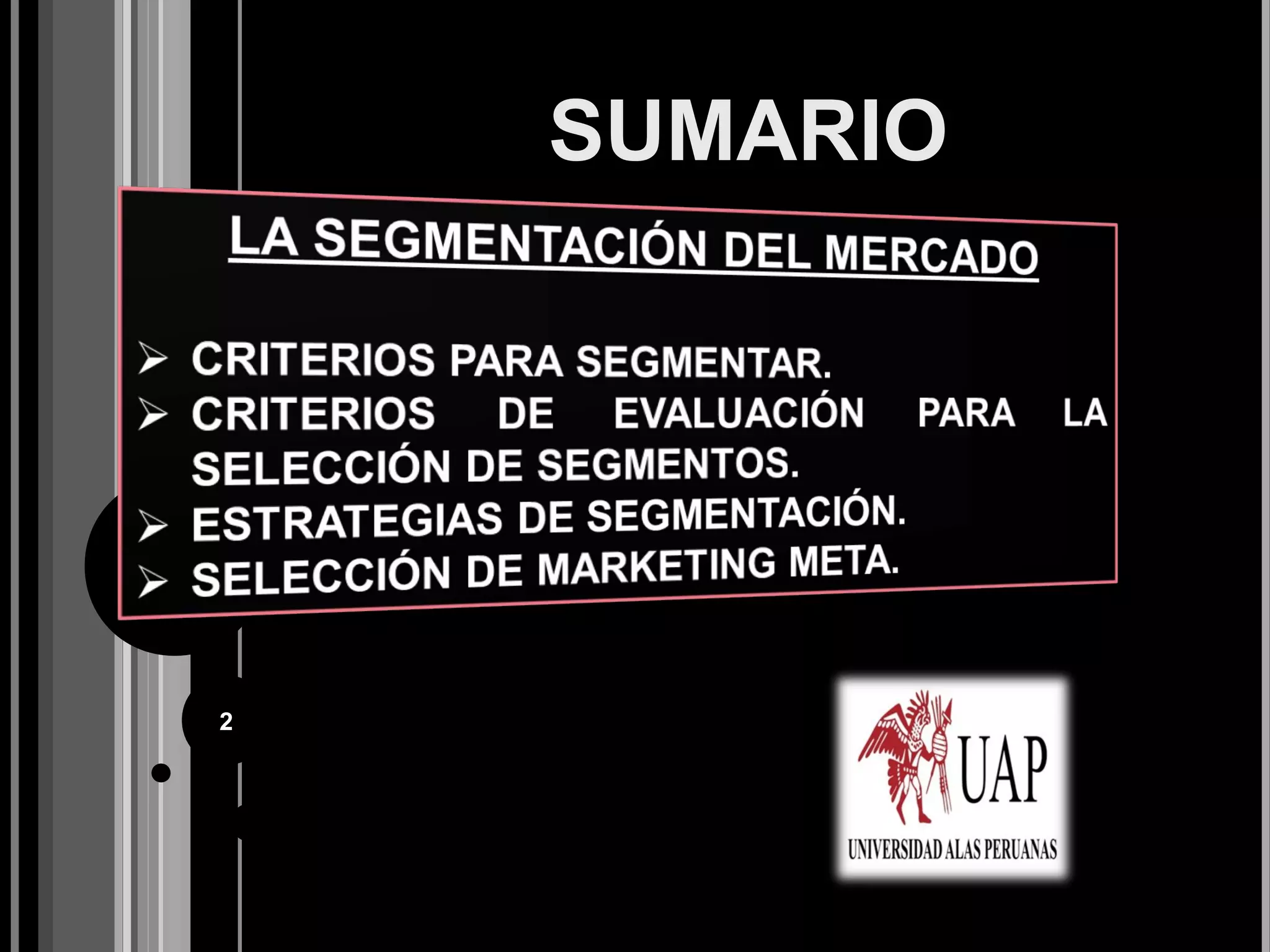 El documento proporciona definiciones de mercado meta de acuerdo a varios autores. Explica que el mercado meta es el segmento de mercado al que una empresa decide dirigir sus esfuerzos de marketing. También describe los pasos para la segmentación de mercados, incluyendo la identificación de bases para la segmentación y el desarrollo de perfiles de segmentos.