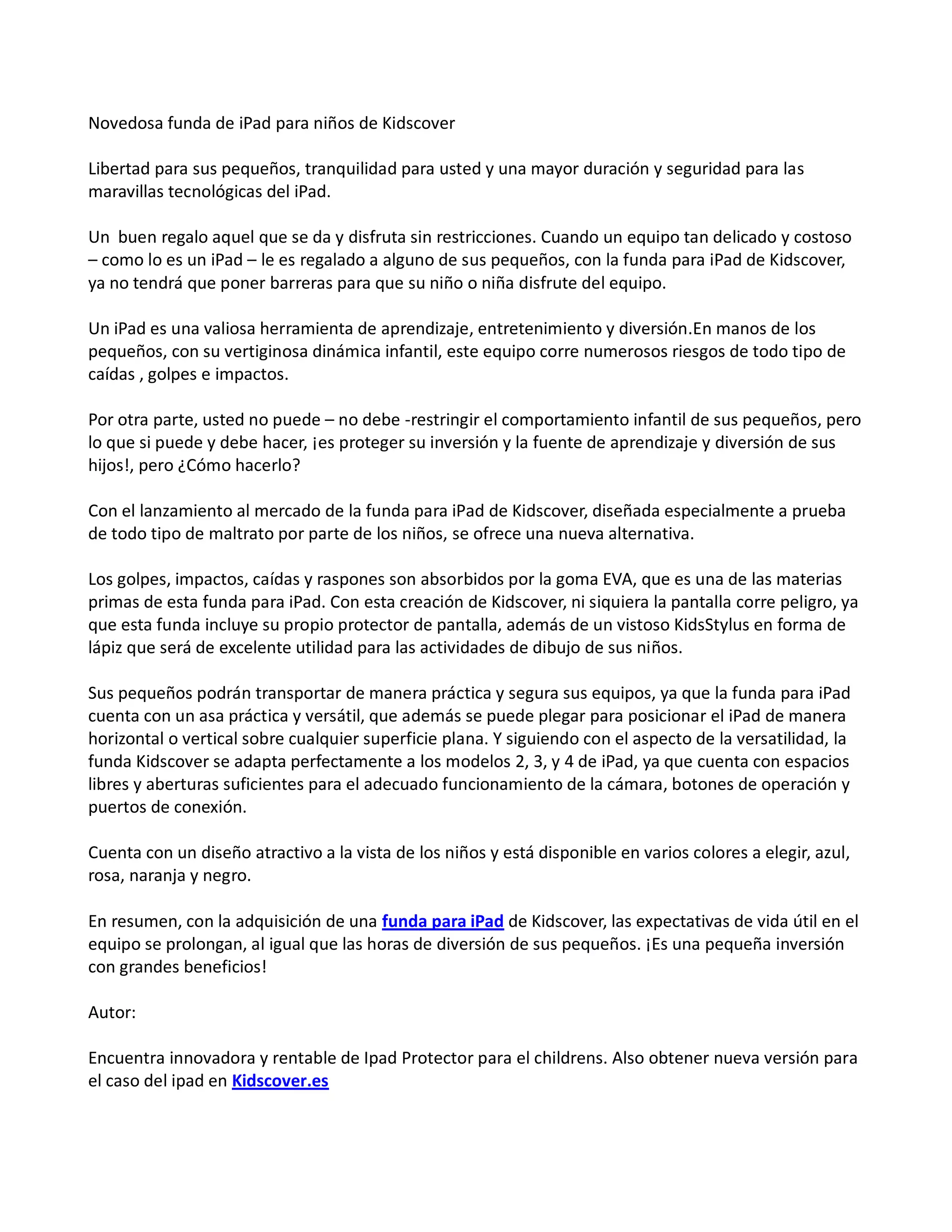 La funda para iPad de Kidscover protege los iPads de niños de caídas, golpes e impactos, permitiendo que los niños usen y disfruten del iPad sin restricciones. La funda está hecha de goma EVA que absorbe los golpes y también incluye un protector de pantalla y un stylus en forma de lápiz. Viene en varios colores y se adapta a los modelos 2, 3 y 4 de iPad, prolongando la vida útil del dispositivo y las horas de entretenimiento de los niños de manera segura y a bajo costo.