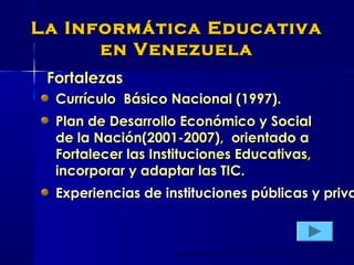 El documento describe la informática educativa en Venezuela, incluyendo las fortalezas como planes de estudio y proyectos que incorporan las TIC, así como debilidades como falta de recursos y continuidad. Explica los Centros Bolivarianos de Informática y Telemática (CBIT) que brindan formación a través de las TIC para docentes, estudiantes y comunidades.