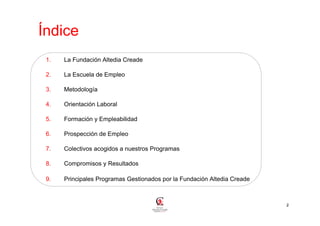 Este documento describe la Fundación Altedia Creade, una organización que ofrece programas de empleo y formación profesional para personas desempleadas. La Fundación fue creada en 2002 por Creade, una compañía líder en recolocación, para ayudar a personas con dificultades para encontrar trabajo. La Escuela de Empleo es el proyecto principal de la Fundación y utiliza orientación laboral, formación y prácticas para mejorar la empleabilidad de los participantes. La Fundación tiene equipos de profesionales en varias ciudades de España.