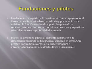 El documento describe los diferentes tipos de fundaciones y pilotes utilizados en la construcción. Explica que las fundaciones sirven como base del edificio para soportar los pesos de la estructura, y que los pilotes permiten transmitir las cargas a través de terrenos blandos hasta terrenos más firmes. También describe los diferentes métodos de construcción de pilotes prefabricados e in situ, y distingue entre fundaciones directas e indirectas.