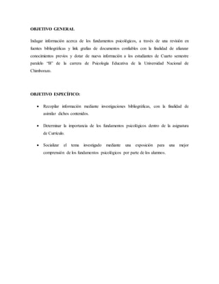 Este documento resume los fundamentos psicológicos del currículo desde diferentes perspectivas teóricas. Explica teorías del desarrollo como la psicomotricidad e inteligencia, y teorías del aprendizaje como las cognitivas, conductistas y humanistas. También analiza la teoría de campo, las asociacionistas, las gestalt y el aprendizaje desde Wittgenstein y Piaget. El objetivo es dotar de nueva información a estudiantes de psicología educativa.
