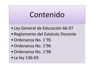 Este documento resume los principales fundamentos legales de la gestión escolar en la República Dominicana. Incluye las leyes y reglamentos más importantes como la Ley General de Educación 66-97, el Reglamento del Estatuto Docente, y varias ordenanzas. También describe los diferentes niveles educativos regulados por esta legislación como la educación inicial, básica, media y especial, así como los derechos, deberes y clasificaciones de los docentes.