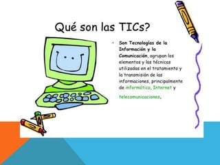 Este documento presenta información sobre las tecnologías de la información y la comunicación (TIC). Explica que las TIC permiten almacenar grandes cantidades de información inmaterial en pequeños dispositivos, permiten la comunicación e interacción rápida entre personas sin importar la distancia, y automatizan tareas. Luego describe diferentes tipos de TIC como redes, terminales y servicios. El documento también presenta el programa "A que te cojo ratón" del Ministerio de Educación de Colombia, el cual busca capacitar a docentes en el uso de herram