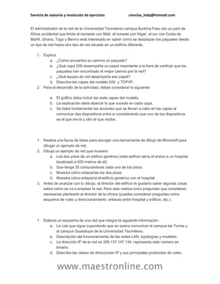 El documento contiene varios ejercicios relacionados con redes de computadoras. Se pide diseñar esquemas de redes, comparar estándares de Ethernet y realizar preguntas sobre la implementación de una red entre un hospital y un edificio anexo. Se proporcionan detalles sobre direcciones IP, capas OSI y TCP/IP, y topologías de redes LAN.
