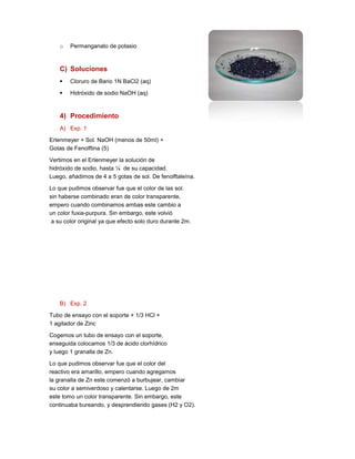 Este documento describe 4 experimentos químicos realizados en un laboratorio. Los estudiantes observan cambios de color y desprendimiento de gases al mezclar ácidos con metales. También ven que al calentar una mezcla negra se enciende. El documento incluye los materiales, reactivos y procedimientos usados y menciona que los estudiantes trabajaron en parejas y no hubo mayores inconvenientes durante las prácticas.