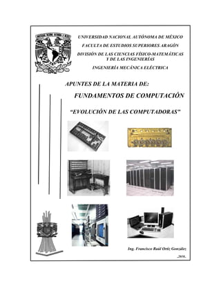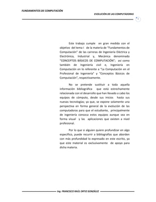 El documento describe la evolución de las computadoras desde sus inicios hasta la sexta generación. Comienza explicando los conceptos básicos de computadora y los diferentes tipos (digitales, analógicas y híbridas). Luego detalla los antecedentes históricos del desarrollo de las computadoras, incluyendo inventos como la Pascalina y el telar de Jacquard. Finalmente, describe las seis generaciones de computadoras digitales desde 1951 hasta la actualidad, clasificando los diferentes tipos de computadoras según su uso y aplicación.