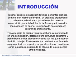 El documento describe los principios básicos del diseño visual, incluyendo la importancia de los elementos, su peso visual, equilibrio y tensión en la composición, así como el recorrido visual del espectador y la percepción del receptor. Explica que cada elemento debe tener una función específica sin interferir con los demás, y que la ubicación y tamaño de los elementos afectan su peso visual.