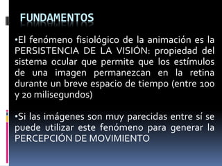 La animación se basa en la persistencia de la visión, que permite que las imágenes permanezcan brevemente en la retina. Si las imágenes son similares y se muestran rápidamente, se percibe movimiento. En la animación, cada fotograma se genera de forma individual modificando el anterior. Esto distingue la animación de videos, donde las imágenes ya existen. La animación computarizada utiliza técnicas digitales como interpolación o animación por fotogramas para generar la ilusión de movimiento.