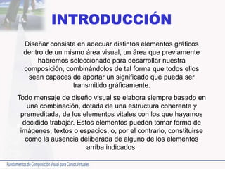 El documento habla sobre los principios básicos del diseño visual, incluyendo el peso de los elementos, el equilibrio formal e informal, la tensión, el ritmo, el recorrido visual, la ubicación de imágenes y elementos, y la percepción del receptor. Explica cómo organizar elementos gráficos para crear una composición efectiva.