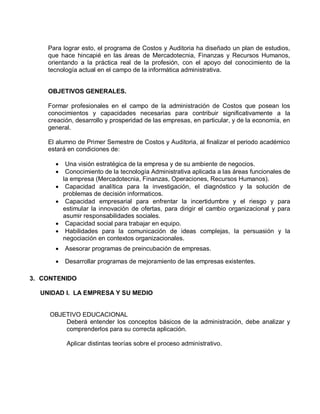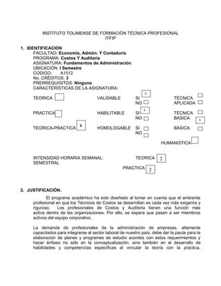 Este documento presenta la información de una asignatura de Fundamentos de Administración que se imparte en el primer semestre del programa de Costos y Auditoria en el Instituto Tolimense de Formación Técnica Profesional. Incluye la identificación de la asignatura, su justificación, objetivos, contenidos organizados en tres unidades principales, estrategias metodológicas y evaluación de competencias. El propósito general es formar profesionales con conocimientos en administración que puedan contribuir al desarrollo empresarial.