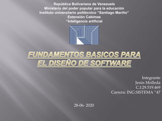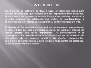Este documento presenta los fundamentos básicos para el diseño de software. Explica que el diseño de software consiste en crear una especificación de un artefacto de software para cumplir unos objetivos utilizando componentes primitivos y sujeto a restricciones. Luego describe los fundamentos como la abstracción, refinamiento, modularidad, arquitectura, jerarquía de control, estructura de datos, procedimientos y ocultamiento de información. Finalmente, cubre temas como el diseño orientado a objetos, garantías de calidad y técnicas de