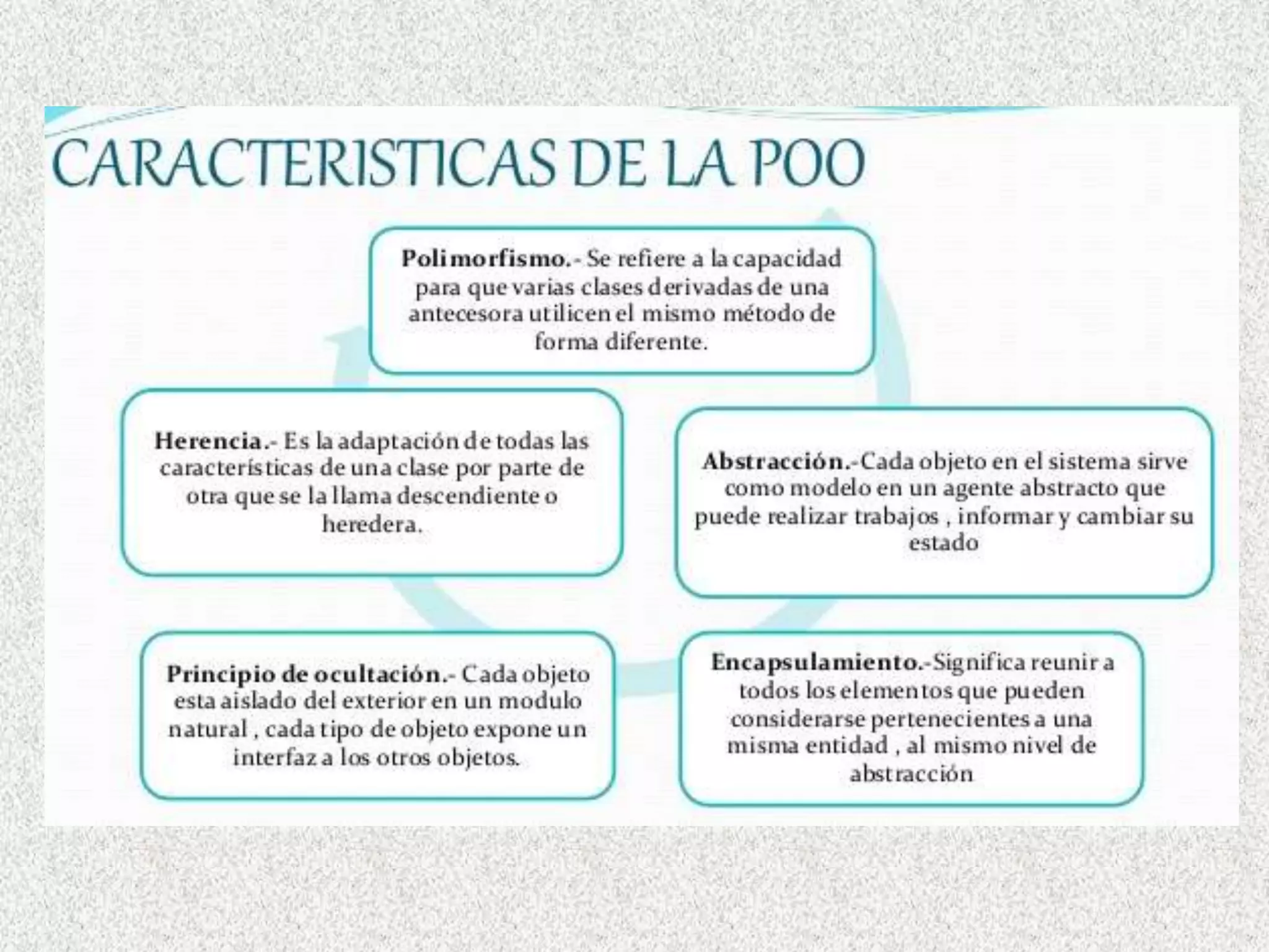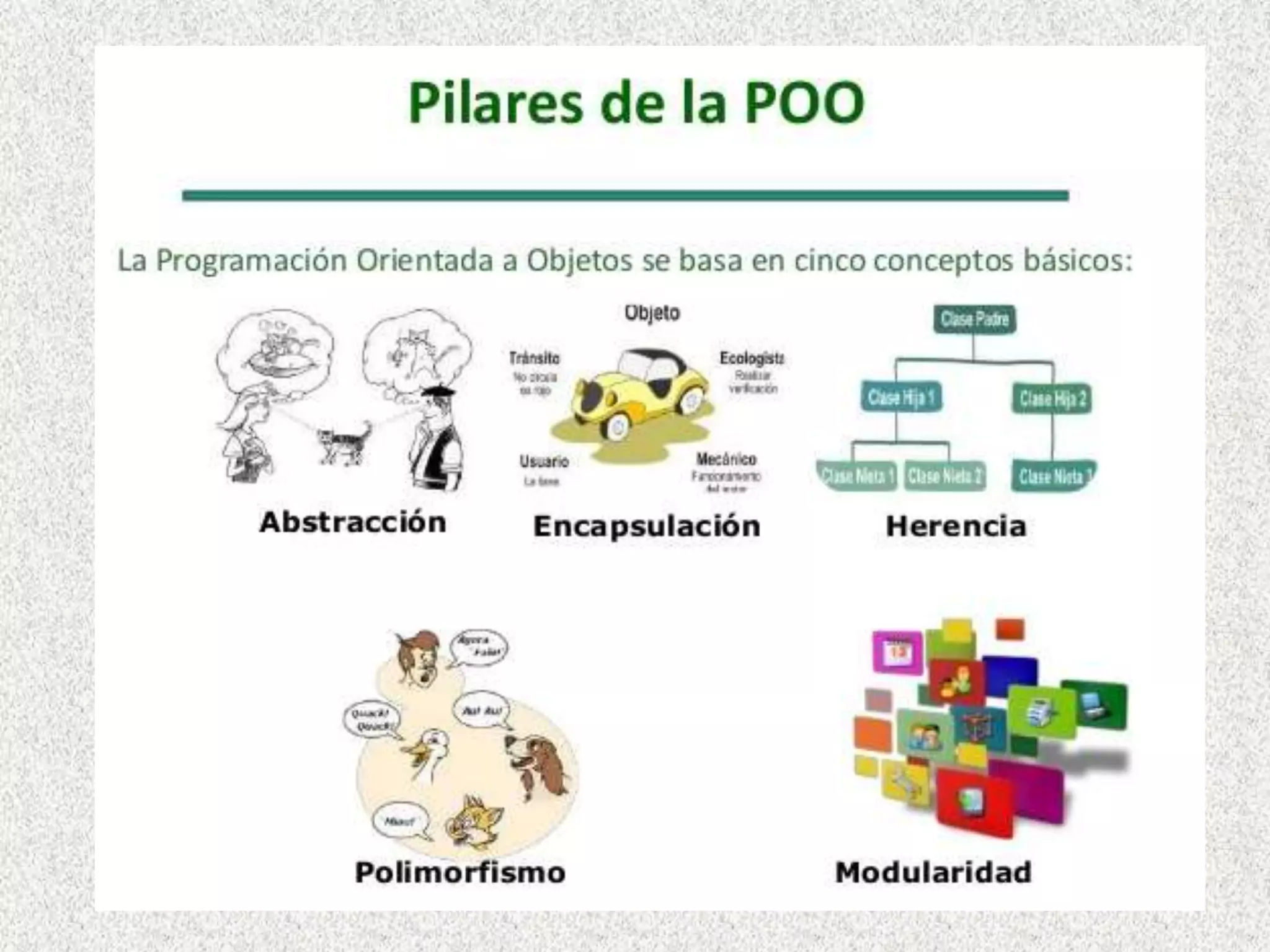 Este documento presenta los fundamentos básicos de la programación orientada a objetos (POO). Explica conceptos clave como objetos, clases, atributos, métodos, abstracción y encapsulamiento. También describe las relaciones jerárquicas y semánticas entre objetos y los objetos dinámicos.