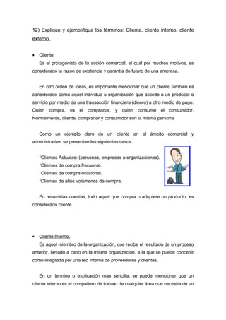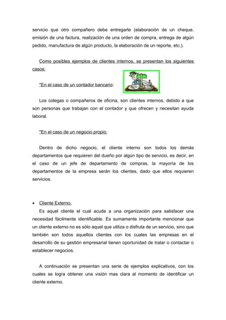 Este documento define y explica los términos cliente, cliente interno y cliente externo. Un cliente es alguien que compra un producto o servicio. Un cliente interno es un miembro de la misma organización que recibe un producto o servicio de otro departamento, mientras que un cliente externo es alguien de fuera de la organización que acude a ella para satisfacer una necesidad.