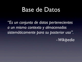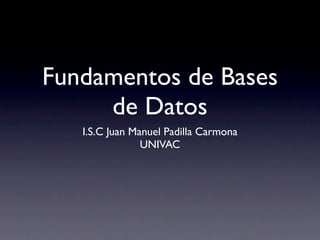 Este documento resume los fundamentos de las bases de datos, incluyendo definiciones, ejemplos, tipos (estáticas, dinámicas, relacionales, multidimensionales, orientadas a objetos), modelos (jerárquicos, de red, transaccionales), y gestión distribuida de bases de datos (homogéneas y heterogéneas).