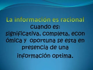 Este documento describe los requisitos de la información, incluyendo que debe ser significativa, completa, económica y oportuna. Luego resume los tipos de sociedades comerciales como unipersonales, Ltda, comandita simple, comandita por acciones y sociedad anónima. Finalmente, explica los libros contables básicos como el diario, mayor, de compras y ventas y remuneraciones que deben llevarse.