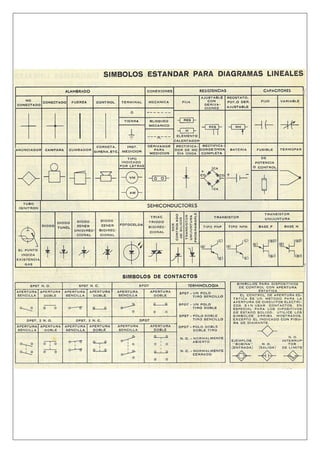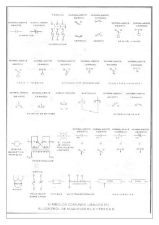 El documento describe los contactores y arrancadores, incluyendo sus componentes y funciones. Los contactores son interruptores electromagnéticos que abren y cierran circuitos de potencia mediante bobinas, contactos principales y auxiliares. Los arrancadores reducen la corriente de arranque de motores de manera manual o automática mediante el uso de resistencias. También se describen los relevadores electromagnéticos y de control de tiempo que se usan como dispositivos auxiliares en circuitos de control.