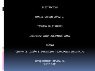 El documento presenta información sobre conceptos eléctricos como circuitos en serie y paralelo, resistencias, voltaje, corriente y fuentes de poder. Incluye preguntas y ejercicios para calcular valores eléctricos usando diagramas y fórmulas. También define y representa gráficamente diferentes componentes eléctricos como resistencias, bobinas, capacitores y transistores. Por último, explica las distintas etapas de una fuente de poder como rectificación, filtrado y regulación.