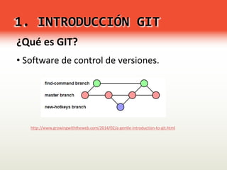 Este documento ofrece una introducción a Git y GitHub. Explica qué es Git, cómo instalarlo, los comandos básicos como iniciar repositorios, añadir archivos, confirmar cambios y crear ramas. También cubre cómo crear una cuenta en GitHub, generar una clave SSH para conectar Git y GitHub, crear repositorios en GitHub y actualizarlos desde la línea de comandos. Incluye enlaces a recursos adicionales para aprender más sobre el control de versiones y estas herramientas.