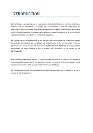 Este documento proporciona una introducción a los fundamentos de informática. Explica que la informática se encarga del procesamiento automático de información mediante computadoras, y que estos sistemas incluyen hardware, software y programas. Luego describe los componentes clave de una computadora como la placa base, procesador, memoria, tarjetas de video y sonido, y unidades de disco. Finalmente, cubre diferentes tipos de computadoras y sus usos.