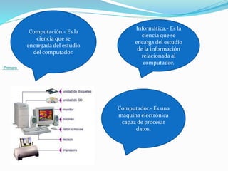 Este documento describe los conceptos básicos de computación e informática, clasifica los tipos de computadoras, describe los virus informáticos, sus métodos de infección y clasificación, los antivirus, los componentes de hardware y software de una computadora, así como las unidades de entrada, salida y almacenamiento.