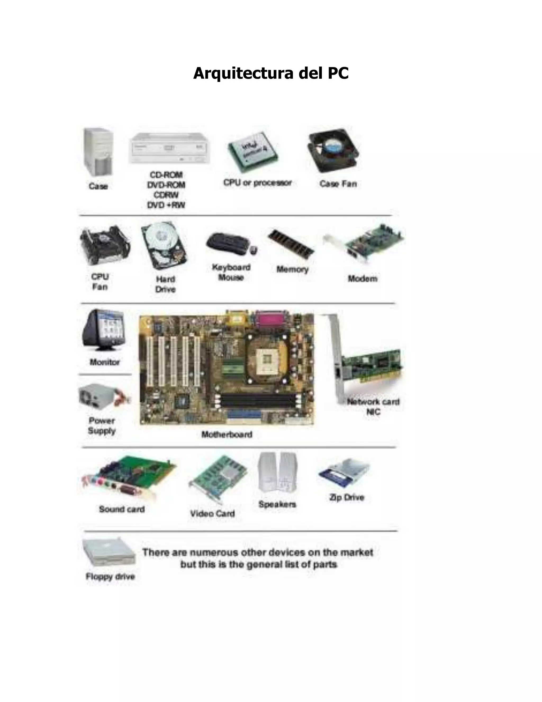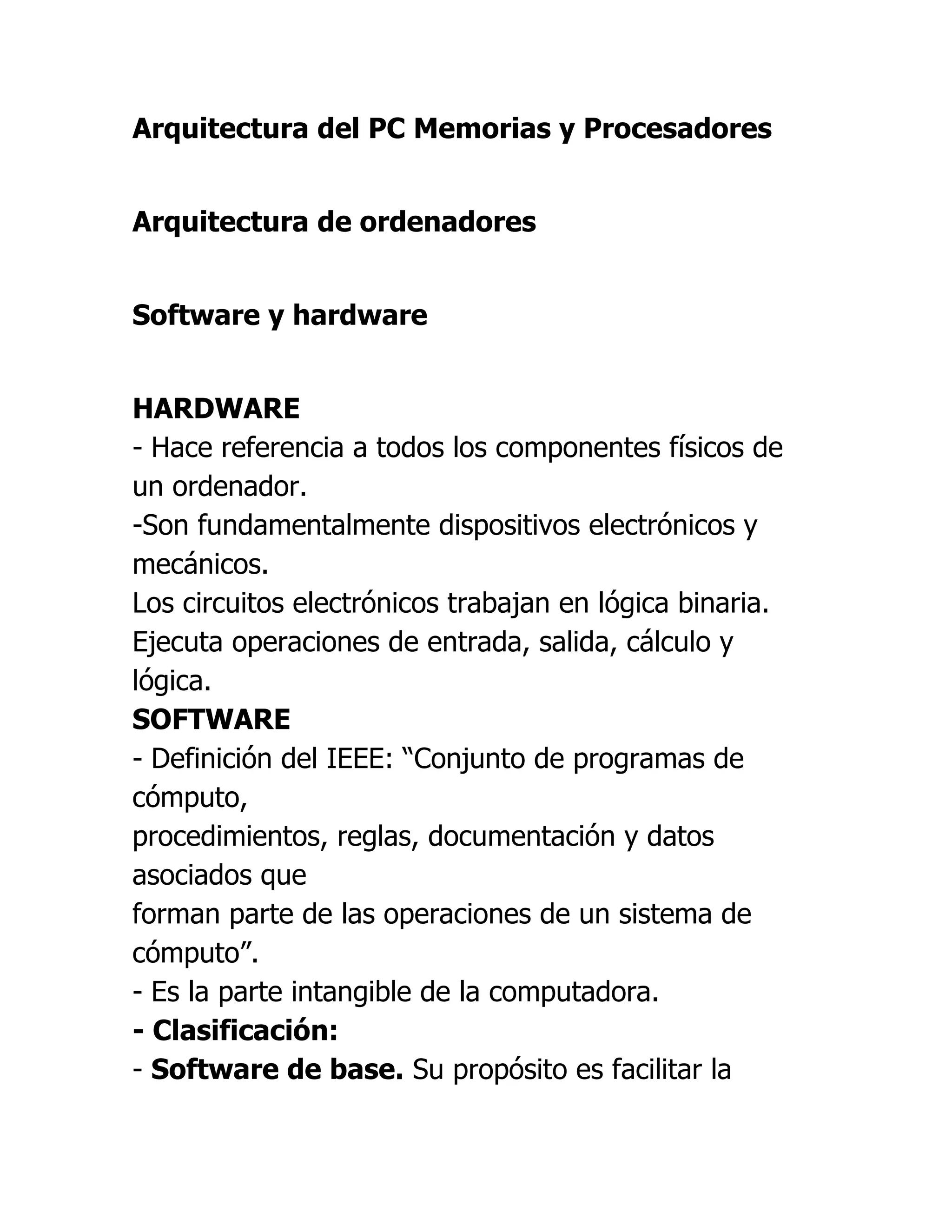 Este documento describe los componentes fundamentales de un ordenador, incluyendo el hardware como la unidad central de proceso, memoria principal, periféricos de entrada y salida, y dispositivos de almacenamiento. También describe el software, como los sistemas operativos y aplicaciones. Explica cómo estos componentes se comunican a través de buses y cómo almacenan y procesan la información en formato binario.