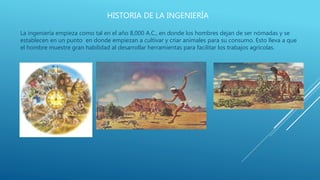 Este documento resume la historia de la ingeniería, su definición y algunas de sus ramas principales. Explica que la ingeniería comenzó hace 8000 años cuando los humanos se establecieron y empezaron a desarrollar herramientas agrícolas. Luego, cubre brevemente la historia de la ingeniería civil, mecánica, eléctrica, química y militar a través de los años. Finalmente, proporciona definiciones y ejemplos de algunas de las ramas más importantes de la ingeniería como la mec