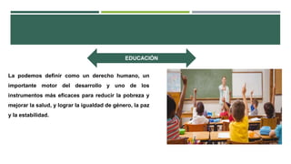 El documento trata sobre los fundamentos de la educación social. Define la educación como un derecho humano y motor del desarrollo. Explica que la educación social busca ayudar la integración social y fomentar la participación cultural. También describe cuatro ámbitos de la educación social y las características que debe tener un educador social.
