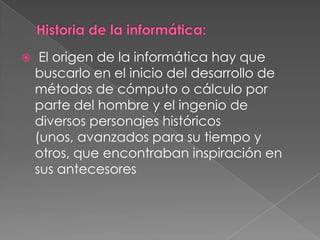 El documento resume los orígenes de la informática y varios conceptos fundamentales como el hardware, software, sistemas operativos, aplicaciones, datos, internet, la web, correo electrónico, multimedia, realidad virtual y algunas fuentes sobre fundamentos de informática.
