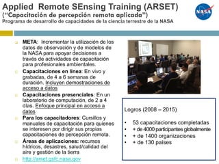 La capacitación de percepción remota aplicada de la NASA (ARSET) busca aumentar el uso de datos de observación y modelos para respaldar decisiones ambientales a través de capacitaciones en línea y presenciales para profesionales globales. Desde su inicio, ha capacitado a más de 4,000 participantes de más de 130 países en diversas áreas como recursos hídricos, gestión de tierra y calidad del aire. La formación incluye fundamentos de percepción remota, tipos de satélites y sensores, y aplicaciones prácticas de datos.