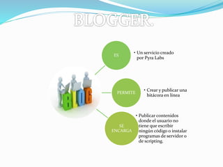 Este documento presenta varias herramientas disponibles en Internet como Blogger, Slideshare y Web 2.0. Blogger permite crear y publicar una bitácora en línea sin necesidad de escribir código. Slideshare sirve para compartir presentaciones y documentos de forma gratuita. Web 2.0 facilita la interacción y colaboración entre usuarios para generar contenido en comunidades virtuales.