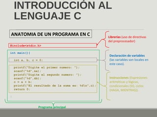 Este documento presenta los fundamentos básicos del lenguaje de programación C, incluyendo la estructura básica de un programa en C, las directivas del preprocesador, las declaraciones de variables, las funciones de entrada y salida, y más. Explica conceptos como tipos de datos, variables locales y globales, y palabras reservadas. También proporciona ejemplos de código C básico.