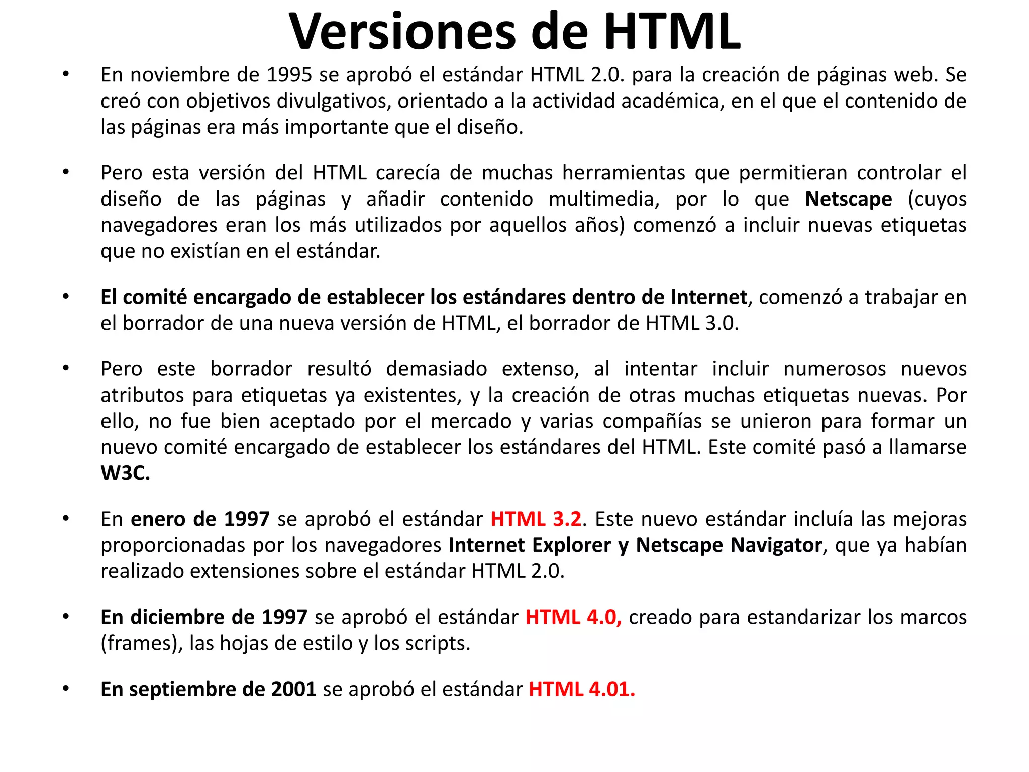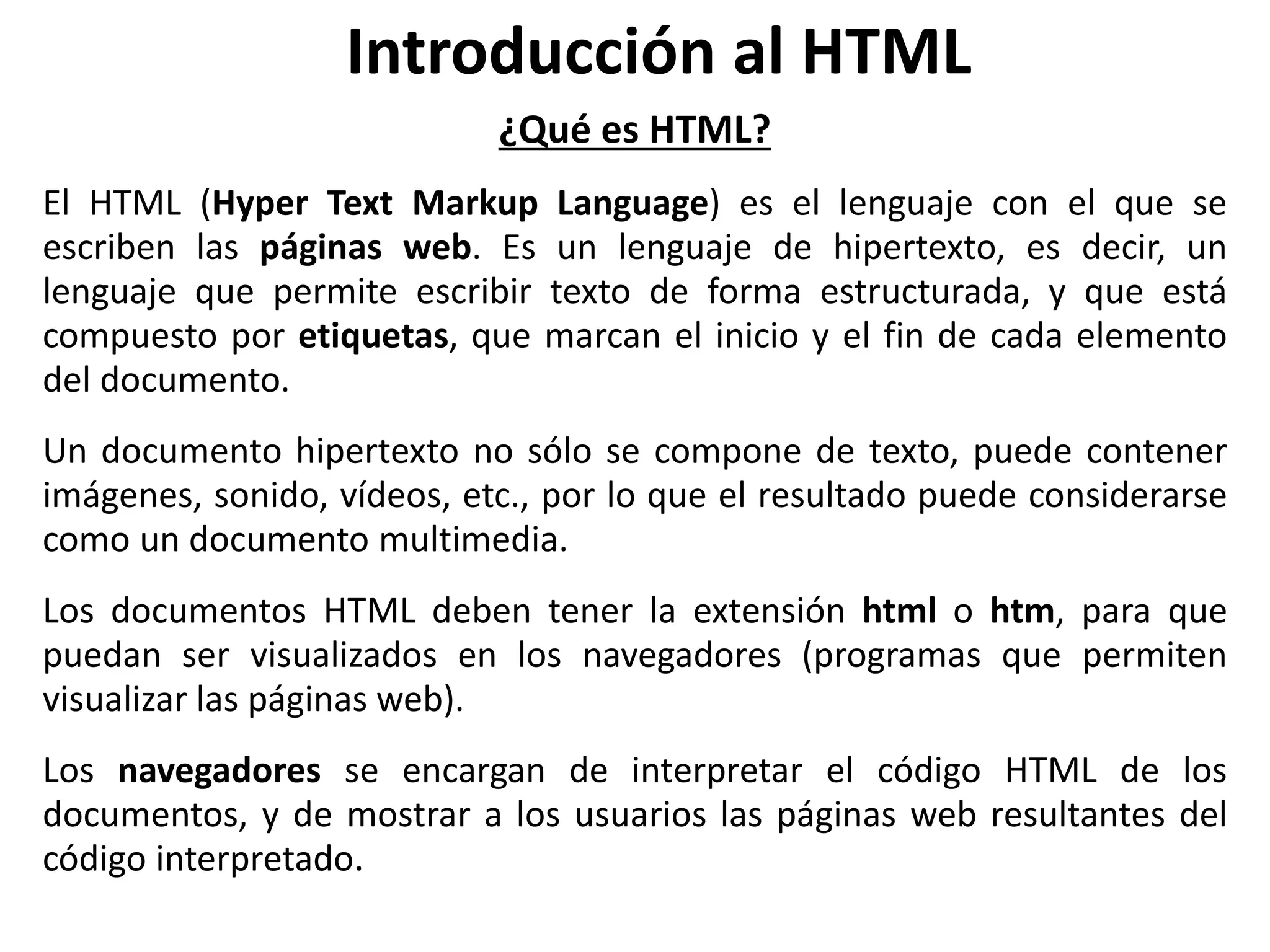 El documento introduce HTML como el lenguaje de marcado usado para crear páginas web, explicando que usa etiquetas para estructurar texto y contener elementos multimedia. Luego resume las versiones clave de HTML desde 2.0 hasta 4.01, destacando las mejoras en cada una. Finalmente, discute cómo los navegadores interpretan el código HTML y la importancia de la compatibilidad entre navegadores, así como las herramientas como editores visuales que facilitan la creación de páginas web.