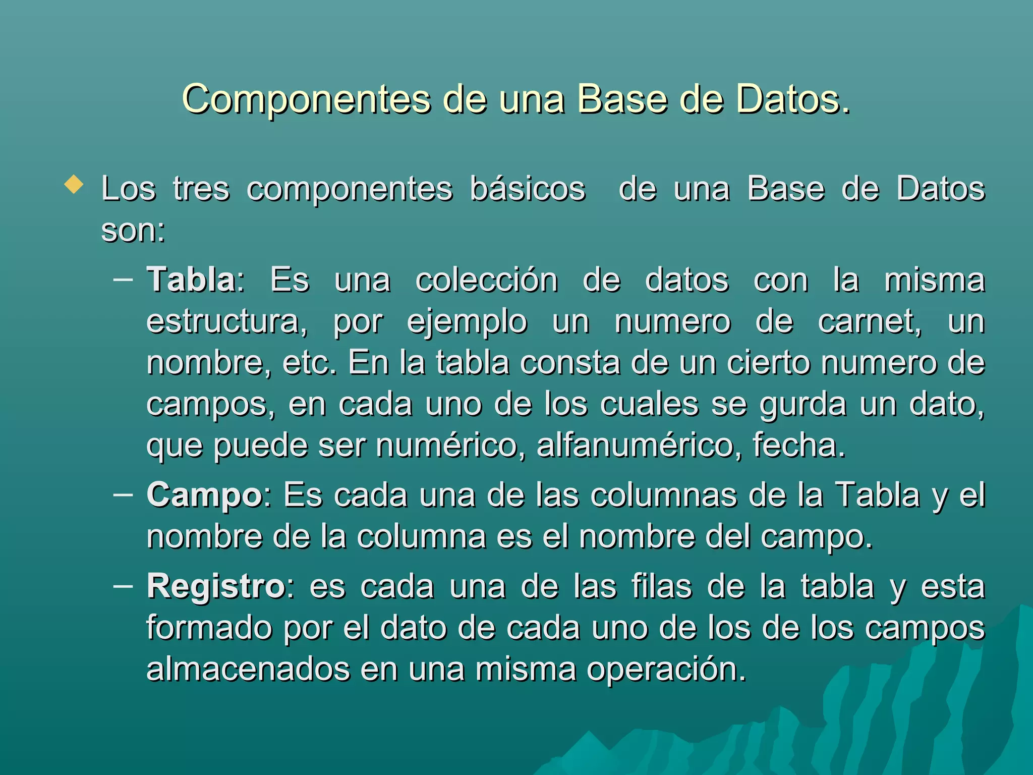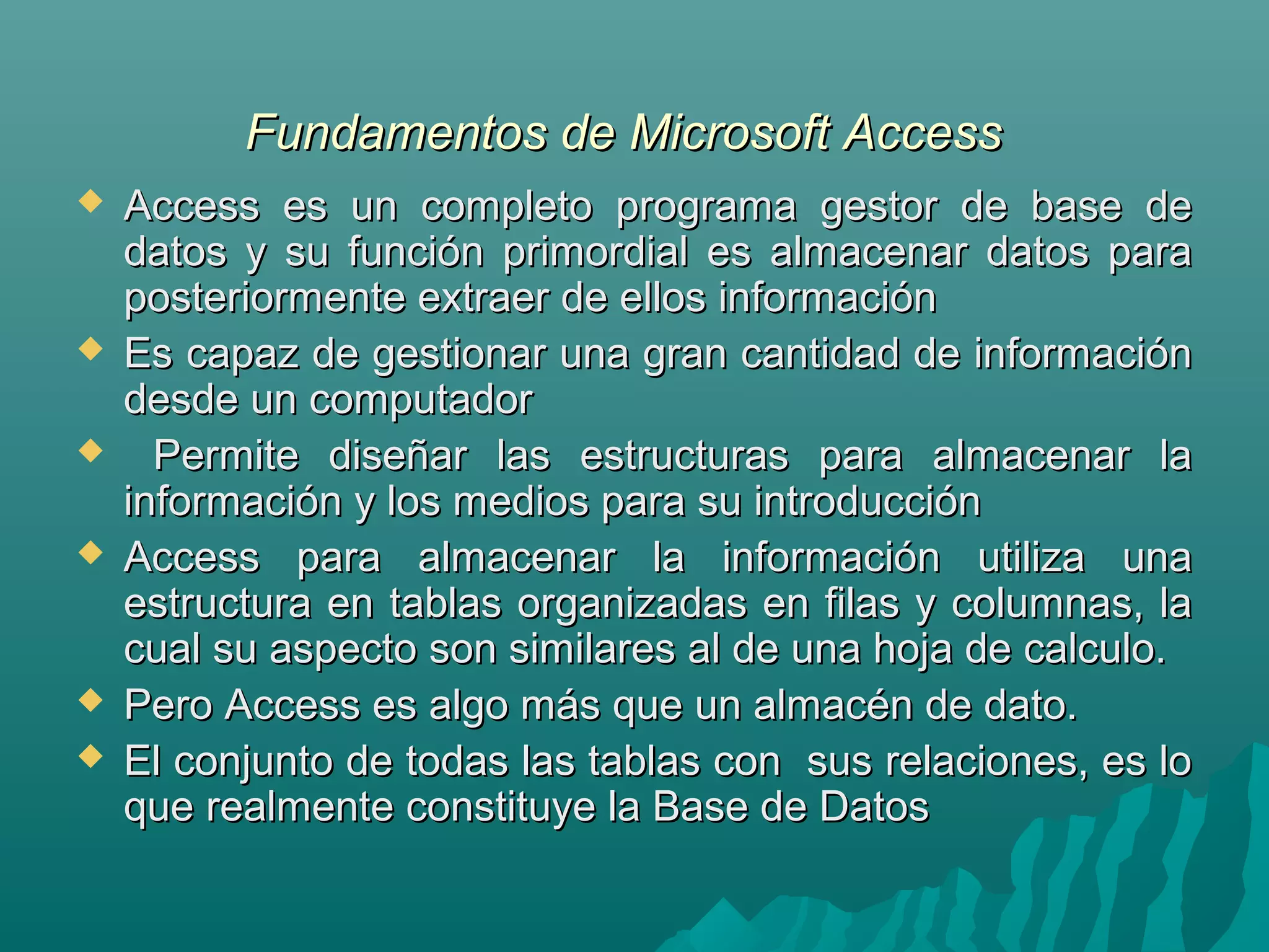 Access es un programa de base de datos que permite almacenar y organizar grandes cantidades de información en tablas, consultas, formularios e informes. Los componentes básicos de una base de datos en Access son las tablas, los campos y los registros. Las tablas almacenan los datos organizados en filas y columnas, los campos son las columnas de la tabla, y los registros son las filas.