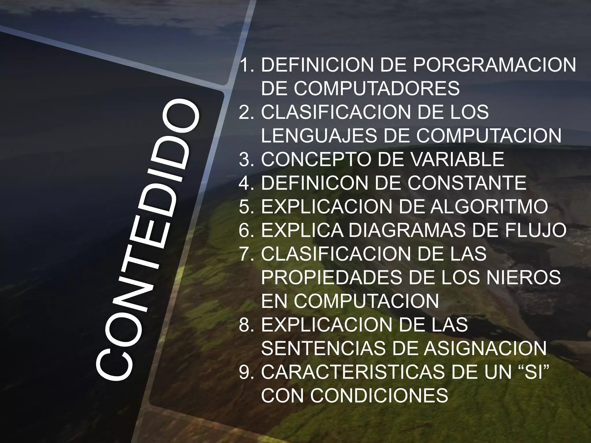 Este documento resume conceptos básicos de programación como la definición de programación, clasificación de lenguajes de programación, variables, constantes, algoritmos, diagramas de flujo, tipos de datos numéricos, sentencias de asignación y condicionales "si".