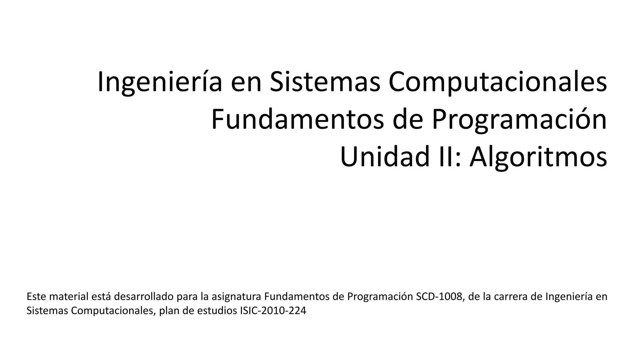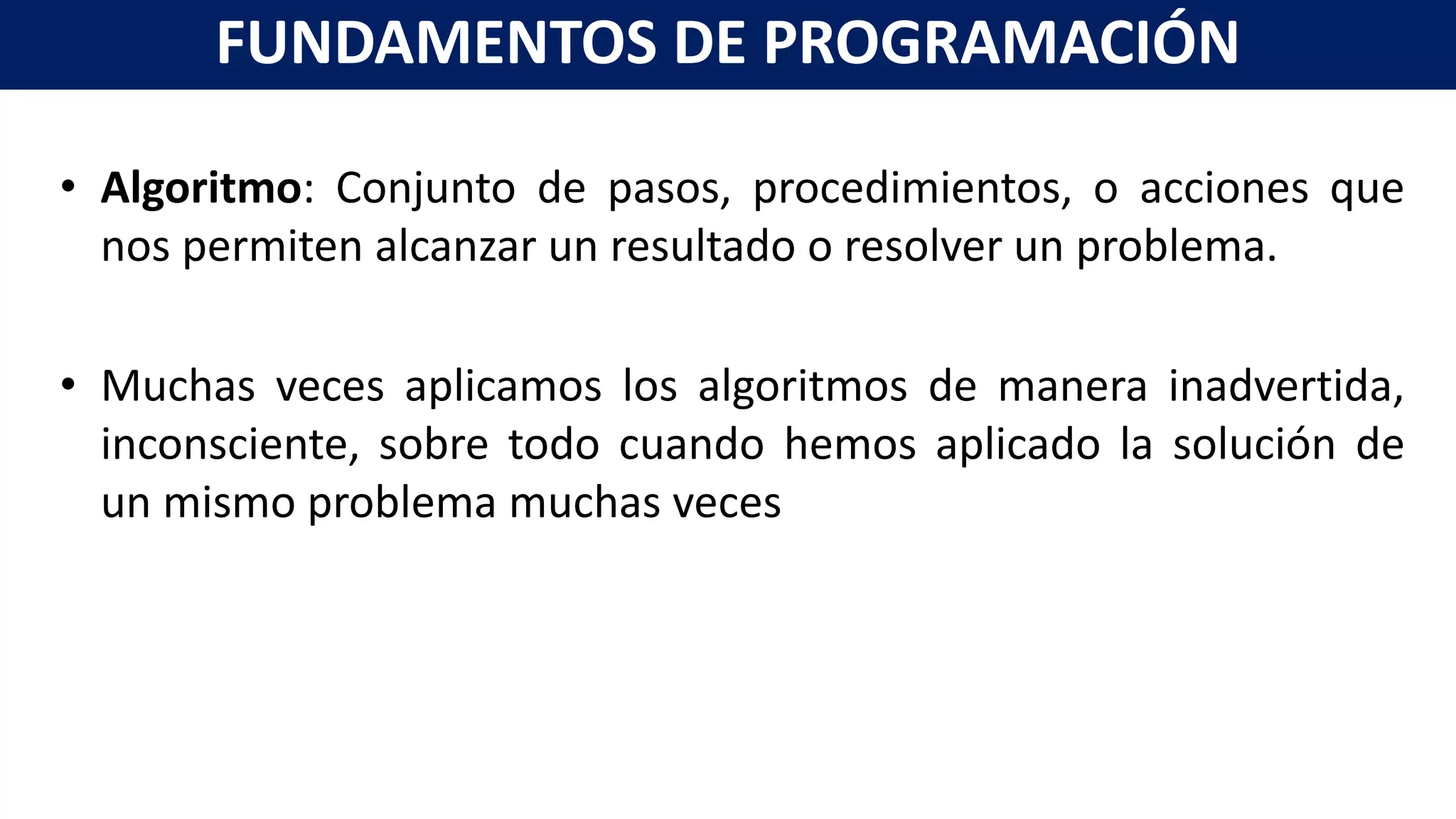 Este documento presenta conceptos básicos sobre algoritmos y programación, incluyendo definiciones de algoritmo, pseudocódigo y diagramas de flujo. Explica las etapas para resolver un problema y las características de los algoritmos. Luego, ofrece ejemplos de algoritmos, pseudocódigo y diagramas de flujo para calcular áreas, valores absolutos y otros problemas. Finalmente, introduce conceptos de estructuras condicionales y operadores lógicos para modelar decisiones en los algoritmos.