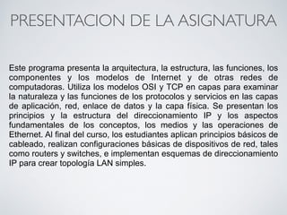 Este documento presenta la asignatura Fundamentos de Redes. Explica que el curso cubre la arquitectura, estructura, funciones y componentes de Internet y otras redes de computadoras usando los modelos OSI y TCP/IP. Al final del curso, los estudiantes podrán implementar esquemas básicos de direccionamiento IP y configurar dispositivos de red como routers y switches para crear pequeñas redes locales.