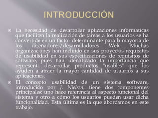 La usabilidad se ha convertido en un elemento clave en el desarrollo de aplicaciones informáticas, buscando facilitar la interacción del usuario con el software. Jakob Nielsen, reconocido experto en usabilidad, ha provisto un marco conceptual para evaluar la eficacia y eficiencia del software, así como la satisfacción del usuario. La evaluación de la usabilidad debe integrarse en todas las etapas del desarrollo, utilizando métodos tanto automáticos como manuales para asegurar que las aplicaciones cumplan con las necesidades del usuario.