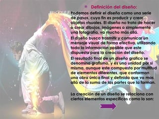 El documento define el diseño como una serie de pasos para crear objetos visuales que transmitan un mensaje de forma efectiva. Menciona que el diseño se aplica en revistas, libros, publicidad, cine, televisión y más. Explica que los tres grupos principales de diseño son edición, publicidad e identidad. Finalmente, señala que un diseño exitoso requiere dominar elementos como el lenguaje visual, la comunicación y la percepción visual, así como administrar recursos de manera efectiva.