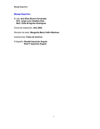 Este documento presenta información sobre masaje deportivo. En el Capítulo I, ofrece definiciones de masaje y una breve reseña histórica del mismo, desde su uso en la antigüedad hasta su aplicación moderna en el deporte. También clasifica los diferentes tipos de masaje, incluyendo masaje manual, masaje con aparatos, masaje deportivo y masaje terapéutico. Los capítulos siguientes exploran la influencia fisiológica del masaje, manipulaciones fundamentales, sesiones de masaje y masaje deportivo específicamente