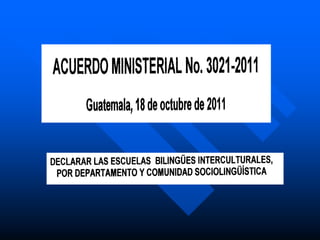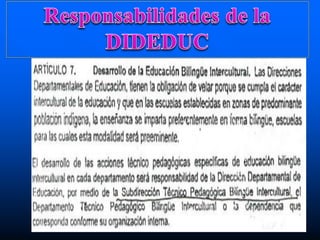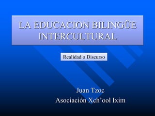 Este documento discute la educación bilingüe intercultural en Guatemala. Explica que la EBI implica un cambio profundo de mentalidad para transformar la escuela de una que desconoce las culturas indígenas a una que valora la diversidad cultural. También destaca la importancia de contextualizar el currículo y adoptar un enfoque que incorpore las lenguas, culturas e instituciones de los pueblos indígenas, más allá de simplemente añadir contenidos culturales. La EBI busca crear una nueva visión educativa para