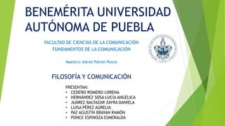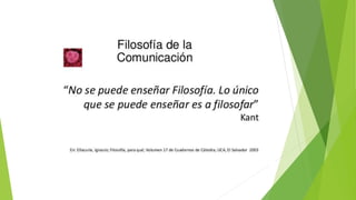 Este documento explora la relación entre la filosofía y la comunicación, resumiendo diferentes perspectivas filosóficas sobre la comunicación como la fenomenología, la hermenéutica y la teoría crítica. Aunque la filosofía y la comunicación no constituyen una disciplina en sí misma, el documento concluye que su mayor punto de encuentro es a través del estudio del lenguaje.