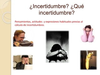 Este documento trata sobre la incertidumbre de la medición. Explica que la incertidumbre surge debido a limitaciones de los instrumentos y efectos ambientales, y que es necesario estimarla y reportarla junto con cualquier resultado de medición. Detalla que la incertidumbre expresa la dispersión de valores posibles atribuibles a una medida, y que se estima identificando y combinando las fuentes de error usando métodos estadísticos y otra información. Además, la incertidumbre juega un papel clave para determinar si
