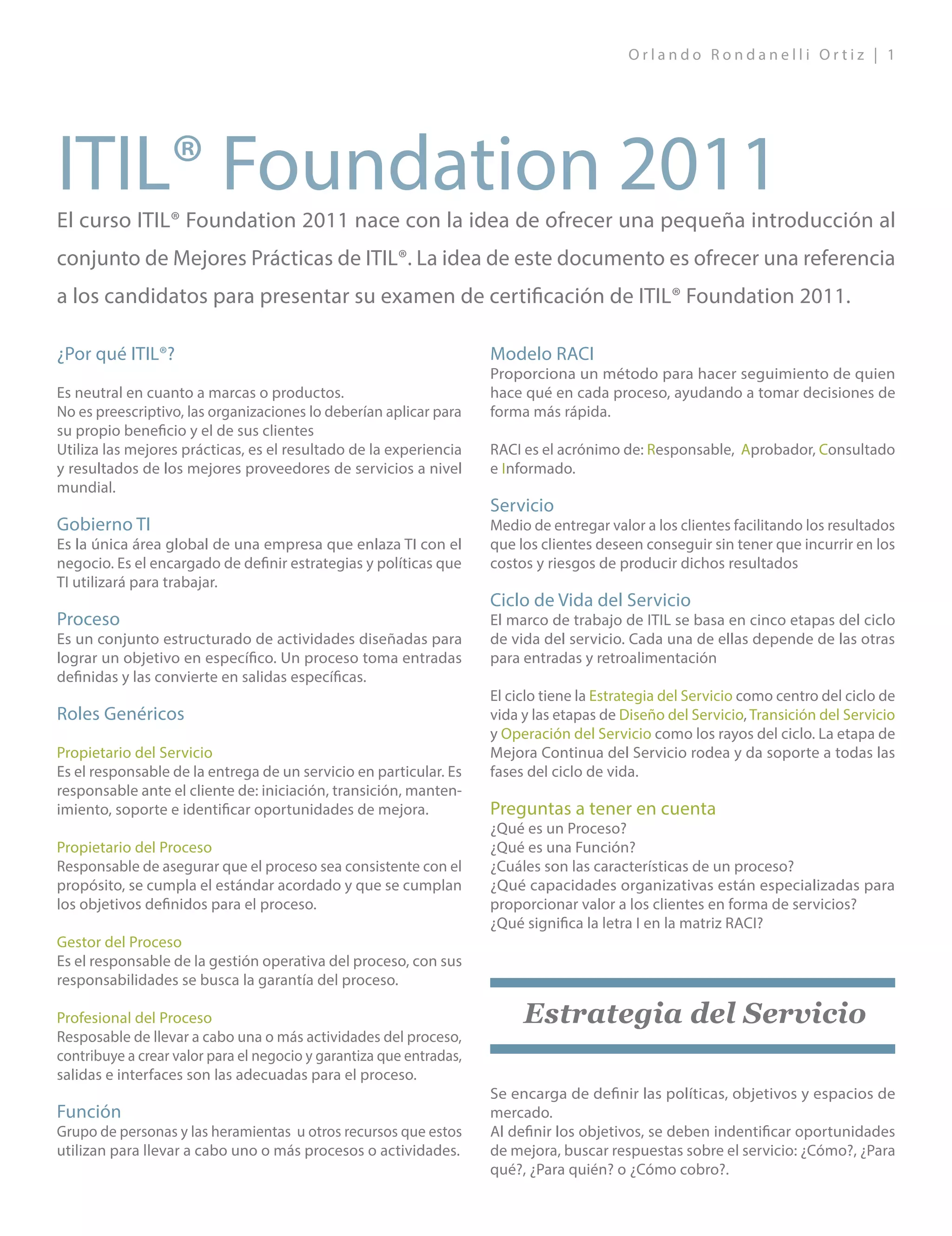 El documento detalla ITIL® y sus mejores prácticas para la entrega de servicios de TI, abarcando desde la estrategia del servicio hasta la gestión de la continuidad. Se describen procesos clave, roles y responsabilidades, así como la importancia de generar valor para los clientes a través de la gestión eficaz. Además, se proporciona una guía para la certificación ITIL® Foundation 2011, destacando la relevancia de los procesos en la creación de valor y la satisfacción del cliente.